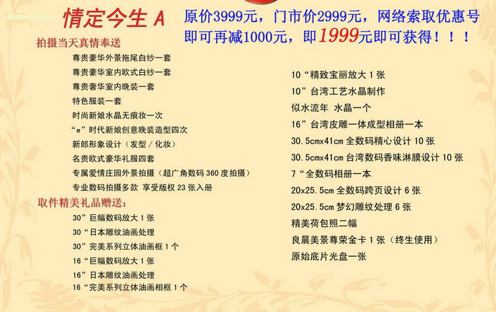 如果您在阅读文字时碰到不清楚的地方,可以通过【经典婚纱摄影网】在线咨询平台进行咨询;如果你需要得到商家VIP服务和折扣优惠,也可以通过我们的免费预约系统提前预约,我们将为您安排!